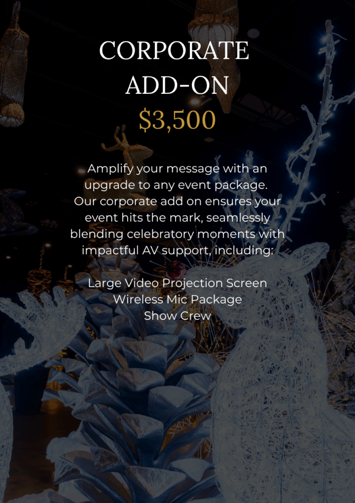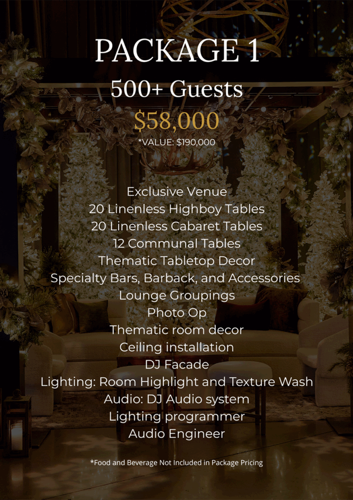 Let us help you perfect your party – catering, beverage packages, entertainment, valet services and more are all additional elements our in-house team can customize for you.
